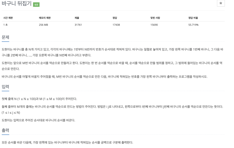 문제 도현이는 바구니를 총 N개 가지고 있고, 각각의 바구니에는 1번부터 N번까지 번호가 순서대로 적혀져 있다. 바구니는 일렬로 놓여져 있고, 가장 왼쪽 바구니를 1번째 바구니, 그 다음 바구니를 2번째 바구니, ..., 가장 오른쪽 바구니를 N번째 바구니라고 부른다. 도현이는 앞으로 M번 바구니의 순서를 역순으로 만들려고 한다. 도현이는 한 번 순서를 역순으로 바꿀 때, 순서를 역순으로 만들 범위를 정하고, 그 범위에 들어있는 바구니의 순서를 역순으로 만든다. 바구니의 순서를 어떻게 바꿀지 주어졌을 때, M번 바구니의 순서를 역순으로 만든 다음, 바구니에 적혀있는 번호를 가장 왼쪽 바구니부터 출력하는 프로그램을 작성하시오. 입력 첫째 줄에 N (1 ≤ N ≤ 100)과 M (1 ≤ M ≤ 100)이..